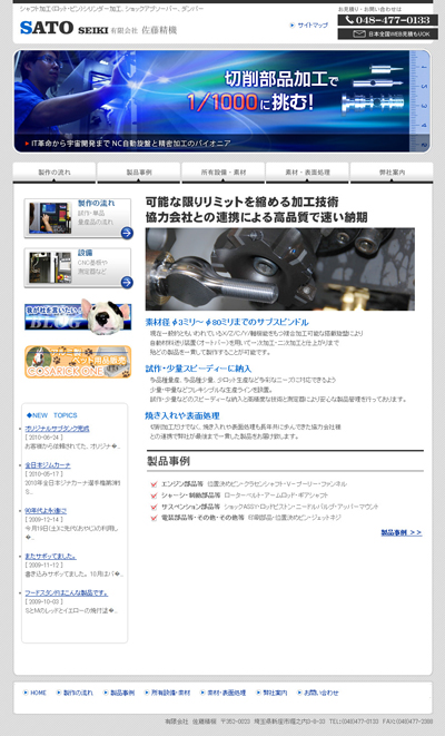 精密切削部品加工、金属加工、旋盤加工、シャフト加工などの精密加工を行っている埼玉県新座市の佐藤精機 様のサイトです。